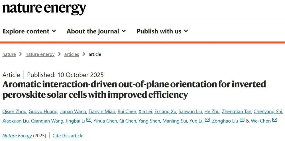 鉴于此,华中科技大学陈炜/刘宗豪、北京工业大学卢岳、深圳职业技术大学李竞白团队合作提出了一种基于芳香相互作用的双分子策略,通过引入6-羟基-2-萘磺酸钾(PHNS)和6-溴萘-2-胺盐酸盐(BNAC),协同调控FA0.95Cs0.05PbI3钙钛矿的结晶过程。PHNS中的羟基和磺酸基与Pb²⁺配位,BNAC中的铵基占据FA⁺位点,两者萘环之间形成紧密的芳香堆叠,促使晶体沿(100)面实现有序的面外取向生长。该策略显著提升了晶体质量、缺陷钝化效果和载流子传输性能,使倒置钙钛矿太阳能电池的功率转换效率达到27.02%(认证效率26.88%),并在连续光照下运行2000小时后仍保持98.2%的初始效率。此外,孔径面积为11.09 cm²的倒置微型模块实现了23.18%的认证稳态效率,全钙钛矿串联太阳能电池的认证效率达29.07%。相关研究成果以题为“Aromatic interaction-driven out-of-plane orientation for inverted perovskite solar cells with improved efficiency”发表在最新一期《Nature Energy》上。